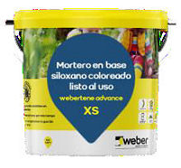 Mortier organique Webertene Advance XS "WEBER", couleur à choisir, gamme Estándar, finition goutte, à base de siloxanes, charges minérales, pigments résistants aux rayons UV, fongicides et additifs spéciaux. Selon NF EN 15824.