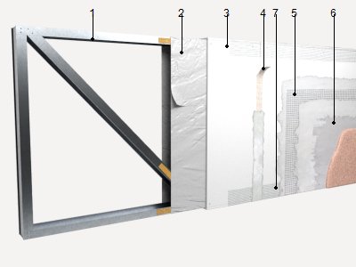 Mise en place et fixation provisoire de l'imperméabilisation. Mise en place et vissage des plaques à la structure. Traitement des joints. Mise en place du profilé d'arrêt en angle. Extension de la couche de mortier base et mise en place de la maille. Application de la couche d'apprêt. Application de la couche de finition.