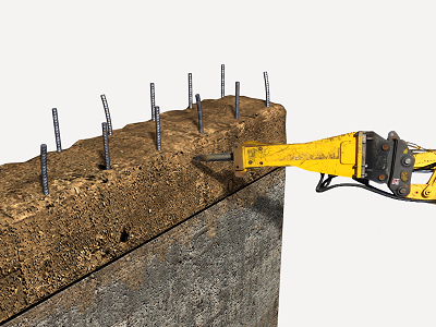 Étêtage d'une barrette, de 30 cm d'épaisseur, par le battage mécanique avec brise-roche hydraulique du tronçon compris entre le niveau de remplissage du béton et le niveau d'étêtage, jusqu'à assurer l'absence de béton contaminé par les boues et la qualité décrite dans le Projet, et chargement des décombres dans le camion ou la benne.