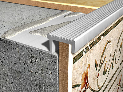 Réalisation d'un arrêt de marches avec un revêtement céramique ou en pierre naturelle, via profilé en aluminium naturel, de 9 mm de hauteur, avec encoches antidérapantes de 20 mm de largeur. Comprend le nettoyage et la préparation de la surface support, l'implantation et la fixation du profilé avec un adhésif et la résolution des liaisons.